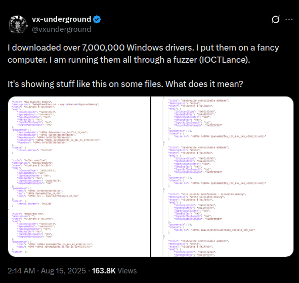 Not long after that, I saw a tweet by vx-underground mentioning roughly 48.5 GB worth of Windows drivers being processed through IOCTLance. There were no conclusions attached, just a large number of drivers and a lot of output.
