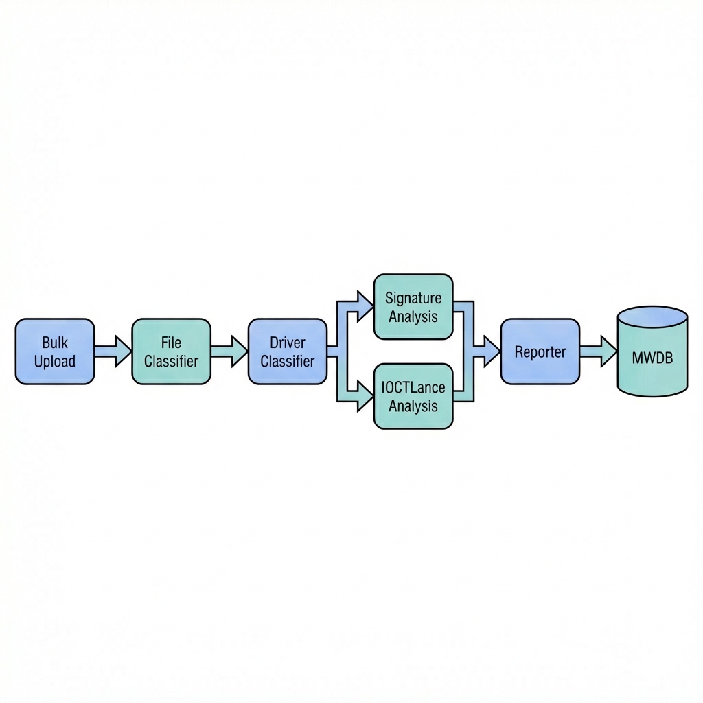 MWDB provided a straightforward way to store samples and browse analysis results. Karton complemented that by offering a simple pipeline model for automated analysis—files are pushed in, workers consume them, and results are passed to the next stage. although this setup is typically used for malware samples, there is nothing about it that makes it specific to user-mode binaries. At its core, it is a way to move files through a pipeline and collect structured output, which also works well for drivers.
