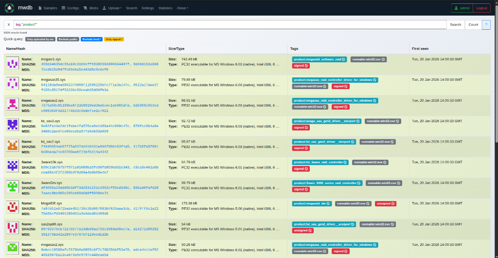 One goal was to group drivers by their product name (e.g., “GeForce”, “Razer Synapse”). However, raw strings from PE version info are often messy, containing spaces, special characters, or inconsistent casing. I implemented a sanitization layer in the Reporter service that uses regex to normalize these strings into valid MWDB tags (e.g., converting ” Razer Synapse 3 ” to product:Razer_Synapse_3). This ensures that the tags remain clickable and useful for filtering.