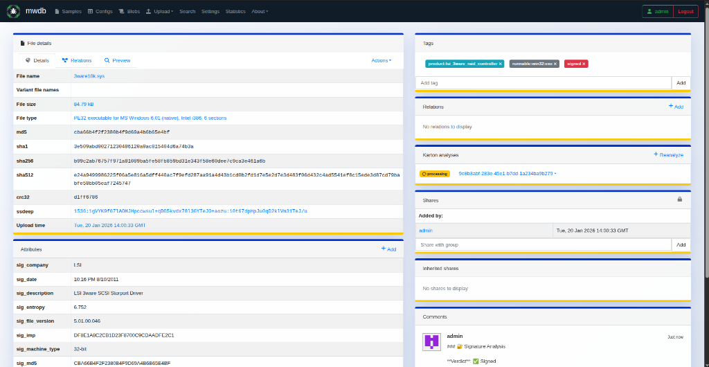 Using MWDB and Karton together meant drivers could be uploaded once, processed automatically, and stored in a central place for later exploration.